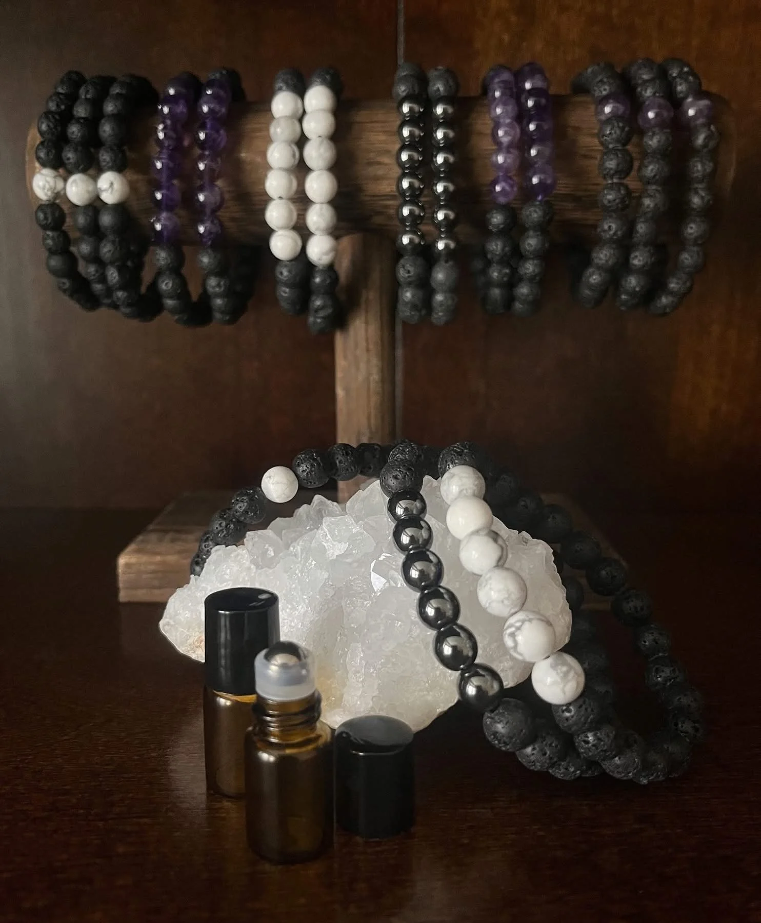 We have curated beautiful Aromatherapy necklaces & bracelets made with lava rock and gemstones that make perfect companions for our essential oil blends!